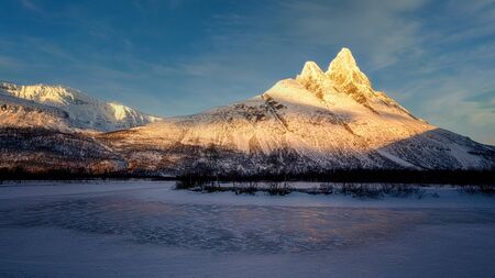 Sunrise on snowy Segla peak on Senja island in winter at Norway