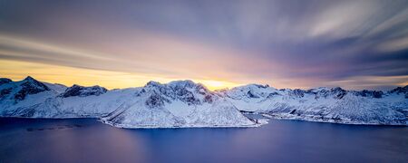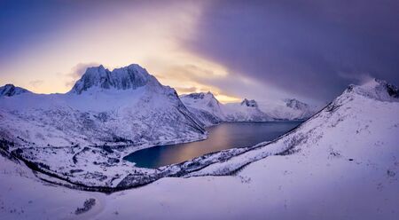 Beautiful winter panorama landscape scene mountain in Northern Norway. Fjords. Arnakken, Keipan Stavelitippen Purkneset Fjordgard