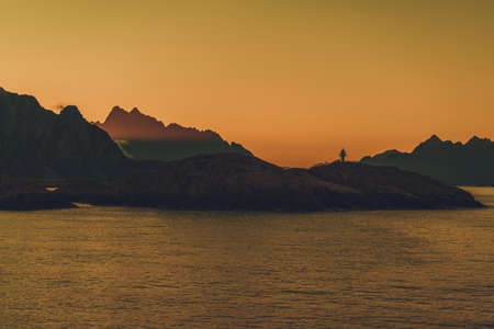 Nordland County City of Svolvær Lighthouse on the Rock. World Famous Lofoten Region First Sun Rays of the Midnight Sunrise. Scenic Norway Summer.