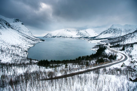 A scenic winter landscape featuring a snow-covered fjord surrounded by mountains under a cloudy sky. A winding road leads through the snowy terrain, with sparse trees dotting the landscape.