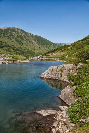 View from Mount Gutyn Tomnatyk to Lake Brebeneskul, a lake in the valley of the Carpathian Mountains, the highest lake in Ukraine. 2020