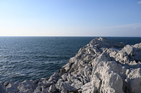 White stones or rocks beach on Cyprus. A view of a sea shore. White rocks and stone coast.