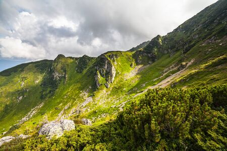 Summer landscape in mountains and the dark blue sky with clouds.