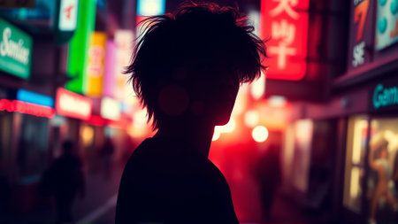 Female traveler with a backpack observes a lively city scene filled with people and colorful billboards, capturing the essence of urban exploration and adventure