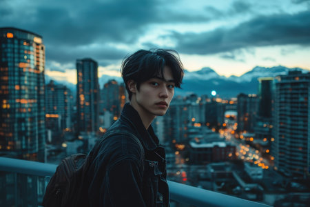 A young man stands on a balcony, looking thoughtfully at the illuminated city below. The twilight sky casts a blue hue, highlighting the mountains in the background.