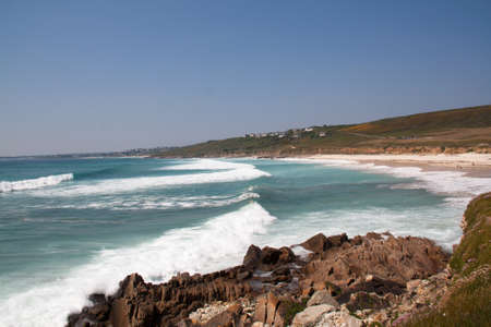 A Cornish coastal landscape looking from Sennen towards Cape Cornwall, with a blue sky overhead