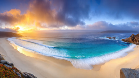A breathtaking panoramic view of a pristine beach cove at sunset. Golden light illuminates dramatic clouds above turquoise waves washing onto the shore.