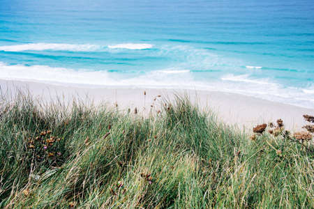 A beautiful shot of the blue sea and a beach with sand and green grass