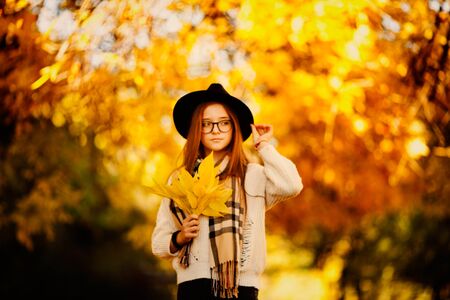 A beautiful young blonde girl with long hair walks in the fall in the park. Autumn portrait. High quality photo