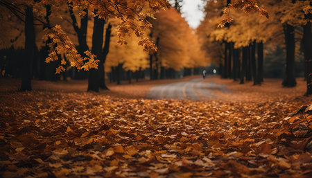 Autumn leaves scattered on a road at golden hour