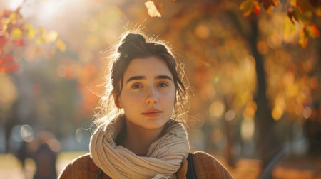 Caucasian woman with long hair and scarf smiling in autumn sunlight. Concept of fall season, warm clothing, outdoor beauty, nature.