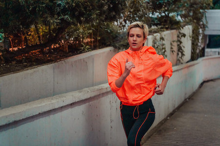 Happy attractive young woman wearing her warm up jacket while running at a local park during her early morning exercise routine, warm sunrise