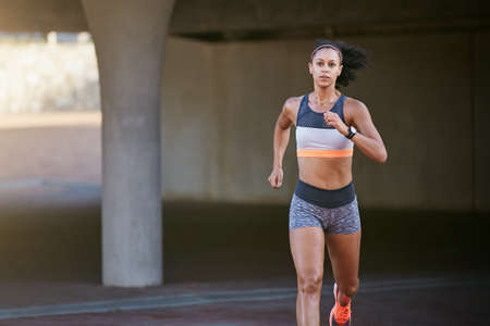 One african american female athlete looking focused while out for run to increase her cardio and endurance. A young black woman running outside to increase her speed and pace. Fitness is a lifestyle