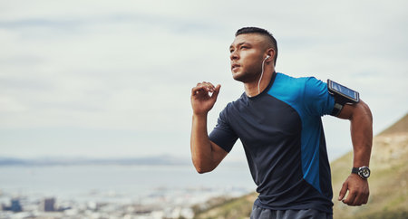 Running, fitness and man with music in nature for exercise, marathon training and health. Sports, mountain and person with earphones listening to audio for cardio, workout and wellness outdoors