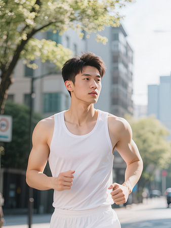 Healthy active Asian man running on track at park in morning .Healthy lifestyle