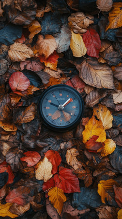 A vintage clock rests on a bed of colorful autumn leaves, nuts, and pine cones, creating a warm and nostalgic representation of the fall season.