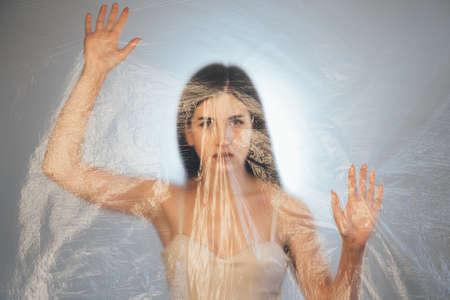 Female protection. Defocused portrait. Gender discrimination. Disturbed worried scared woman trapped behind transparent wrinkled polyethylene film texture on light background out of focus.