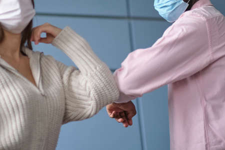 young businesswoman wearing mask bumping elbows with African-American colleague as contactless greeting in post pandemic office. selective focus