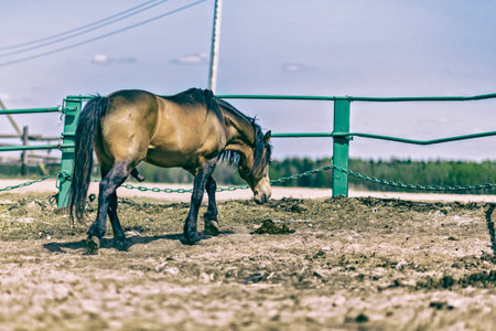 A brown horse looks into the camera. Portrait of a horse. ranch at sunset