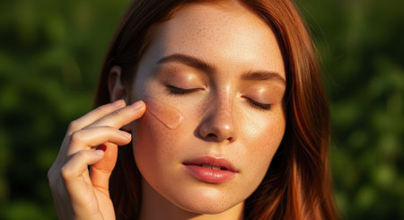 Redhead woman with freckles applying a translucent, shimmering skincare product to her cheek with closed eyes, outdoors in natural light.