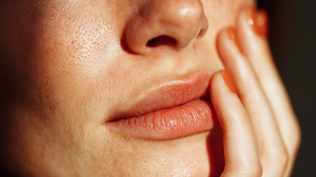 Close up of a woman's lips and skin texture, highlighting imperfections and orange nail polish