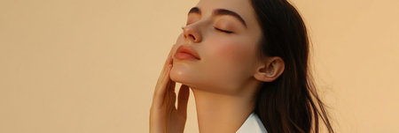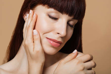 Stunning young woman touching her smooth healthy skin on face and keeping eyes closed while posing over beige studio background. Beauty and care concept.