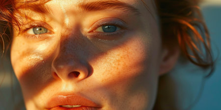 Close up of a fashion model showcasing her freckled skin and lips, bathed in warm sunlight