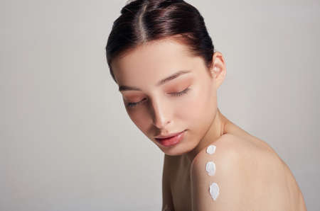 A young girl with clean skin and brown hair sits sideways on a light background. Cream on the shoulder with brush strokes. Body cream on the shoulder. Beauty and spa care. Body care.
