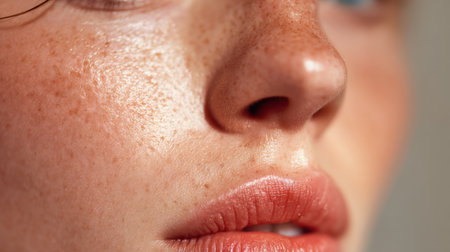 This image features a close-up view of a beautifully freckled face, highlighting the soft lips and natural skin glow. It captures the essence of youth and authenticity.