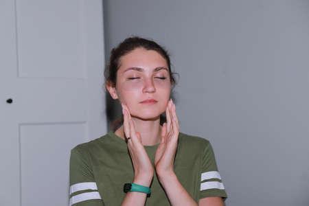 Close up portrait of young caucasian woman doing facebuilding yoga facial gymnastics yoga massage.