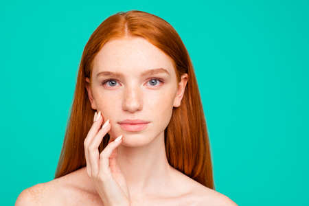 Close-up portrait of nude calm red-haired girl with shiny pure.
