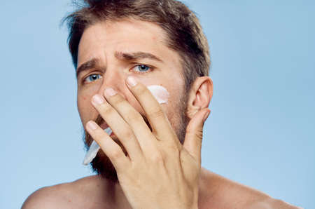 With slow massage movements, the woman applies the cream on her shoulder. A seminude woman takes care of her skin close up on a blue background. The concept of skin and body care. Natural beauty.