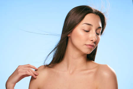 Beautiful woman naked shoulders cosmetics clean skin charm gray background studio