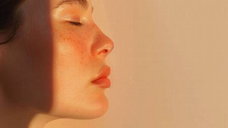 This close-up portrait captures the delicate skin features of a young woman, emphasizing natural freckles and a soft glossy finish in warm light settings.
