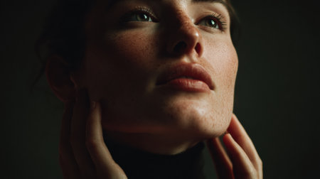 Close up portrait of young woman with natural makeup, showcasing glowing skin and soft features. light creates beautiful play of shadows on her face, enhancing her profile
