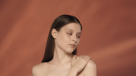 Close-up shot of a beautiful woman with perfect skin and bare shoulders. she looks at the camera and touches her hand to her lips.