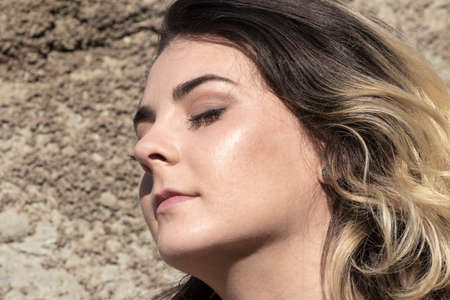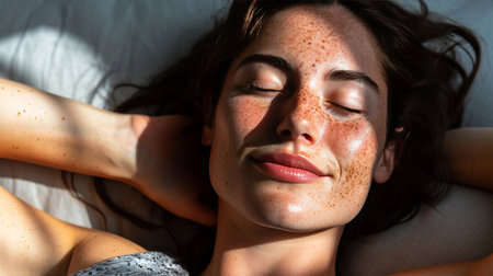 A close up of serene young woman with freckles and closed eyes in warm sunlight
