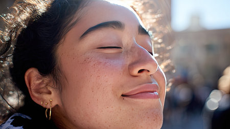 A serene close-up portrait of a young woman with freckles, basking in sunlight, capturing the essence of joy and tranquility in an urban environment.