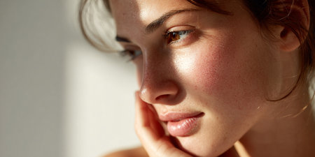 Woman touching her cheek, showing natural skin texture and freckles in a close up portrait
