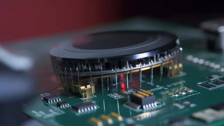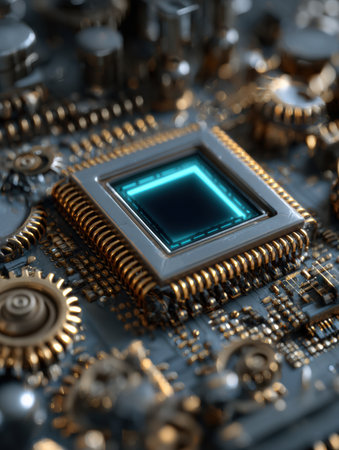 This scene showcases a close-up view of an electronic circuit board featuring a central processing unit surrounded by delicate metal gears and components.