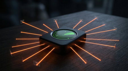 Device with circular radar display rests on a wooden table in low light. Orange light beams radiate from the device suggesting wireless signals and sensor activity. Moody tech scene evoking electronics and navigation themes