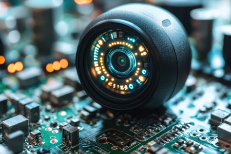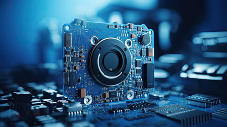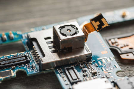 Camera with lens on electronic integrated circuit Board. The concept of high technology and robotics