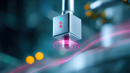 Closeup of a sensor mounted on a piece of equipment sending data wirelessly to a central processing unit with visual indicators of temperature pressure and wear levels