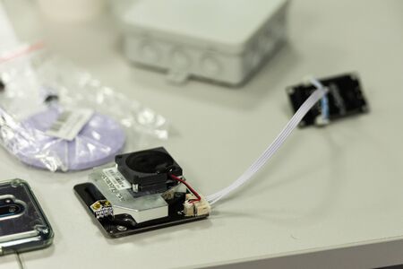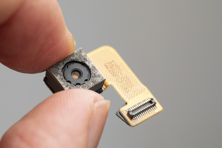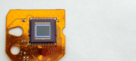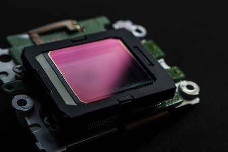 Camera inside, parts of sensor matrix close up. Fixing technology modern device.
