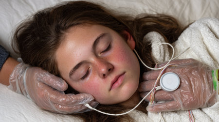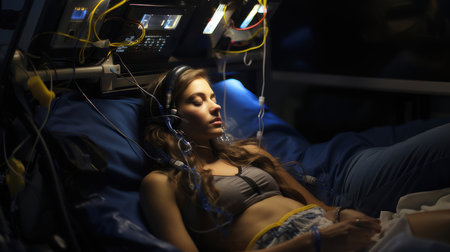 A young female patient lies in a dimly lit room, connected to advanced medical monitoring devices, during a scientific sleep study to assess her sleep patterns and health.