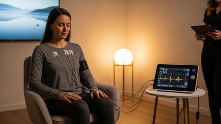 A woman is seated comfortably in a chair while undergoing a medical examination. She has electrodes attached to her body, connected to a device displaying her heart rate and other vital signs.