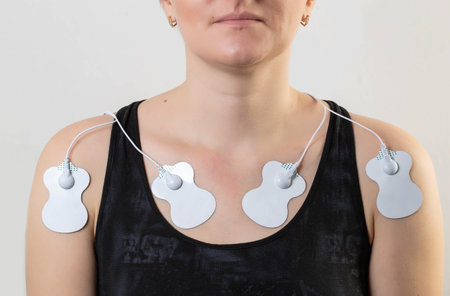 Woman receiving myostimulation treatment in physical therapy clinic.