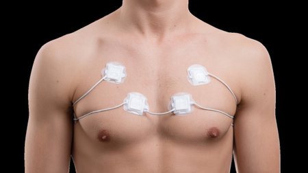 A close-up of a male patient wearing a portable heart monitor with electrodes attached to the chest. The medical setup is used for health diagnostics and monitoring cardiac activity.