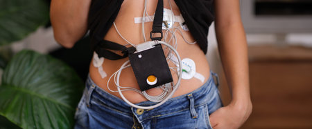 24-hour ECG monitoring and Holter monitoring on a woman body