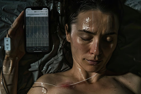 In a dimly lit room, a woman with black hair is lying on a bed holding a cell phone displaying the word ecg. The scene emphasizes darkness, bare chest, and human beauty